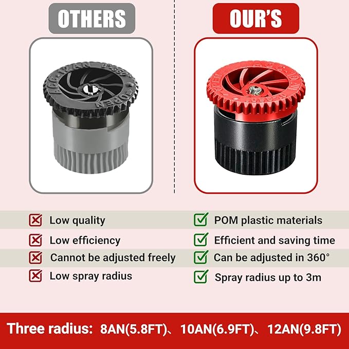 - Excellent Material: Our adjustable sprinkler replacement are made of POM engineering plastic, which is durable, moisture-resistant, and wear-resistant, and not easily deformed or worn. It has been extensively tested in practice and widely favored by users. This is an excellent sprinkler heads for lawn irrigation systems.