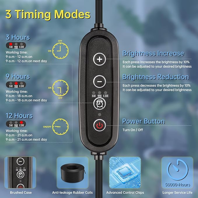 - Auto On/Off Timer : The timer function can help you save up to 80% of power consumption. Auto circular memory timing function has 3/6/12H modes for you to choose,under the condition of continuous power supply, The plant lights will automatically turn on at the same time each day as you set., even you're on the travel, these grow light strips will still take good care of your plants every day!