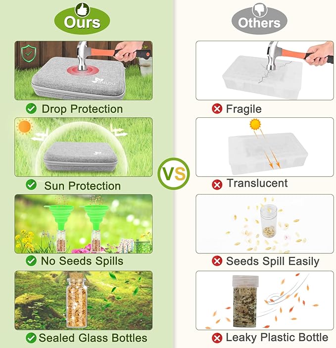 - [Ultimate Seed Protection]: All seed organizer storage boxes are inserted securely in sponge holes to avoid collisions between boxes. Compared to plastic boxes, SMUJU sturdy seed storage box with dual zipper is made of premium Oxford cloth and EVA, which can provide an additional layer of protection and reduce the likelihood of seed damage. And seed storage bag can provide light-proof protection, allowing seed to maintain vitality for longer.