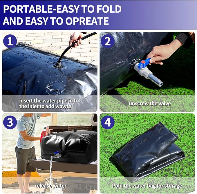 - đ§ăConvenient and PracticalăThe large-capacity water storage bladder container is designed with a faucet and 4 portable pull tabs, when you need to use water, just open the water outlet valve. As a non-potable water storage and rainwater recycling collector, it is suitable for drought, fire prevention, emergency water, outdoor agricultural irrigation, etc. It is practical!