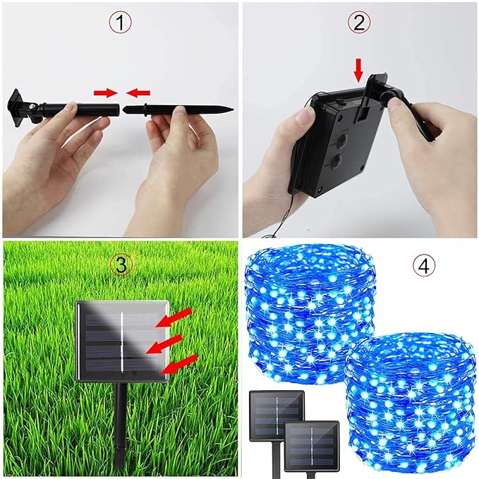 - [Solar Powered & Auto On/Off]: These blue solar lights are powered by a high-efficiency solar panel. After 8 hours of charging in full sunlight, they run for 10–12 hours at night. Lights turn on automatically at dusk and off at dawn—no wiring, no electricity cost, just clean energy and lasting brightness.