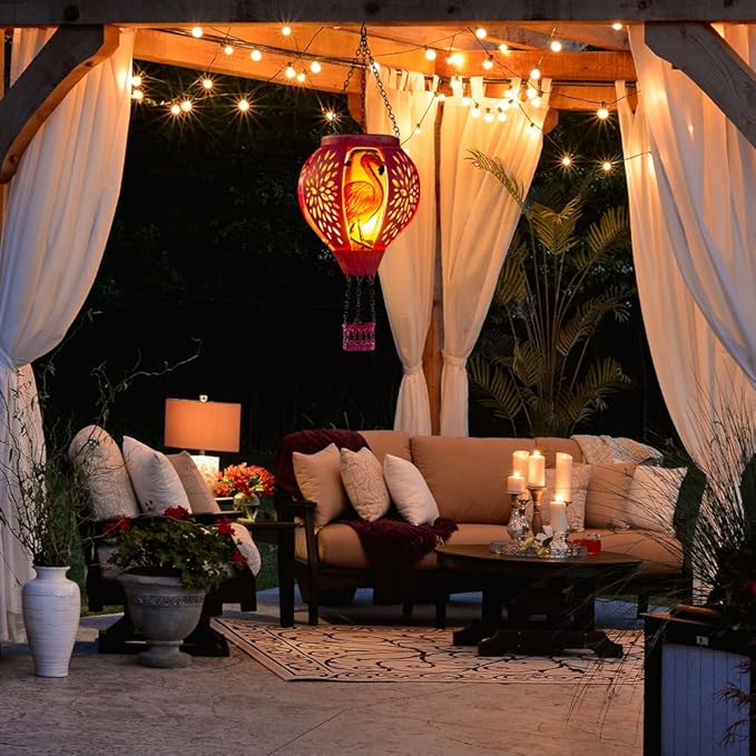 - 🦩【Pink Hot Air Balloon Solar Lantern】This is a unique hot air balloon solar lantern. It is pink, with stained glass flamingos, delicate metal cutouts patterns, and flickering flame lights. Whether solar hot air balloon hanging garden light is lit or not, it will be a beautiful sight in your garden.