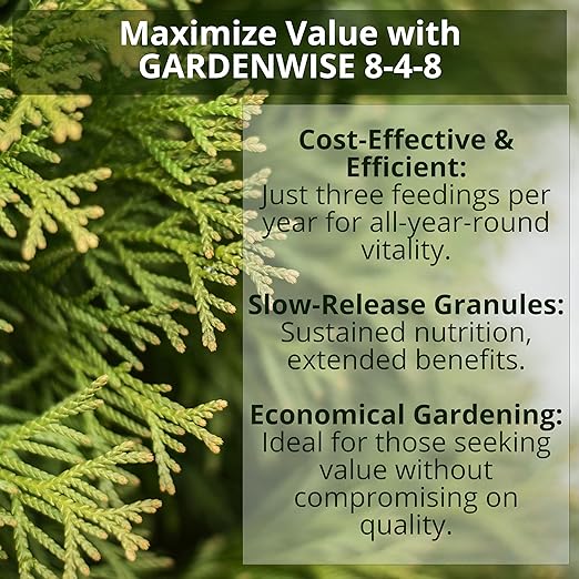 - 💵 ECONOMICAL LONG-LASTING FORMULA: GARDENWISE 8-4-8 is not only cost-effective but also incredibly efficient, requiring just three feedings per year. Its slow-release granules ensure sustained nutrition and long-lasting benefits, making it an ideal choice for gardeners seeking an economical solution for maintaining their plants' health and vibrancy throughout the year.