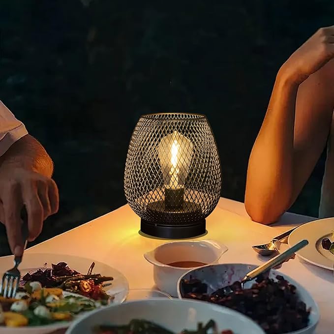 2 Pack Battery Operated Lamp Outdoor Table Lantern,Metal Cage Cordless Lamps with LED Bulb for Weddings Parties Patio Events Indoor Outdoor Patio Bedroom Living Room(Black
