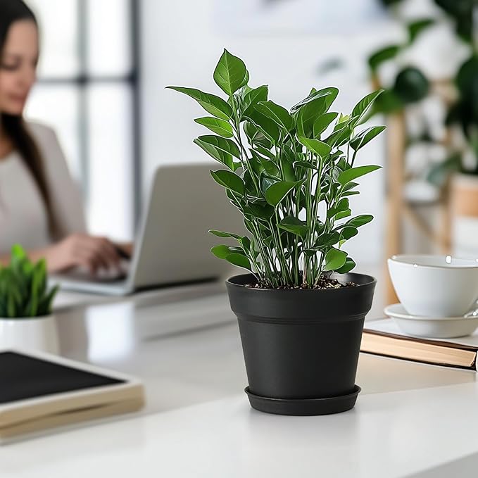 T4U 7.5 Inch Plant Pots 12-Pack - Small Plastic Planter with Drainage Hole and Saucer, Decorative Nursery Pot Bulk for African Violet, Snake Plant, Succulent and All House Plants Indoor (Black)