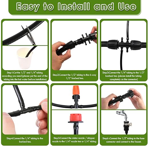 - Large Drip Irrigation System - Use our irrigation set to take care of your plants: 20FT 1/2" + 50FT 1/4" irrigation tubing can water all plants at once. After simple installation, the large irrigation kit can irrigate an area of 110 square feet.