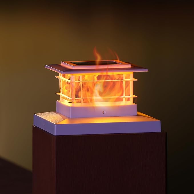 - WHITE PLASTIC SHELL DANCING FLAME SOLAR POST LIGHTS: 2 pack modern post cap lights powered by solar, each with 72 pcs yellow SMD LED, they are the perfect decorative outdoor lighting and no electricity required. Solar LED flickering flameless candles lights, add a 360 degree viewing angle illuminate charming to your garden, decorate your fence, deck, porch or yard. Measurement: 5.8 x 5.8 x 3.54 inches