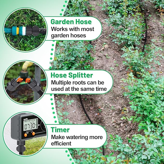 - Easy to Use: Our garden soaker hose, compatible with standard 3/4" threads, effortlessly connects to faucets or other hoses(please make sure the water pressure is within 60PSI), and can also be connected to a timer. Once installed, simply turn on the switch, and it will automatically water your plants, freeing up your hands instantly and making your irrigation process easier and more efficient. The ease of installation allows you to effortlessly build your irrigation system.
