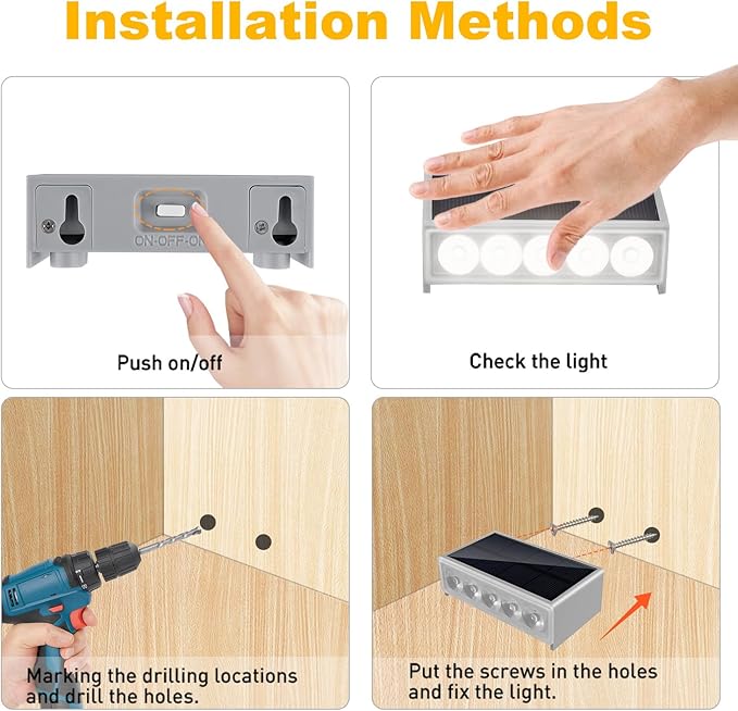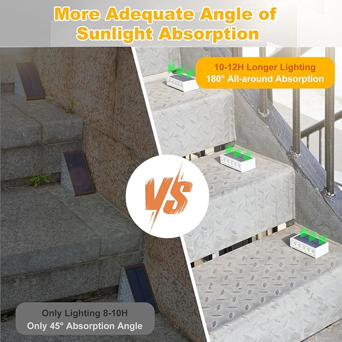 - 【10-12H Long Lighting】Solar LED step light in the case of sufficient sunshine, the solar charging time is 6-8 hours, which is enough to supply power to the outdoor step light for up to 10-12 hours. Push on/off: pushing left or right means turning on the light, easy to operate and save your precious time.
