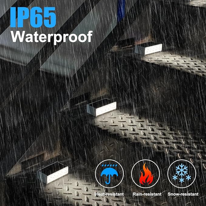 - 【Water & Pressure Resistant】Outdoor solar step light with ABS shell is tough and durable, light weight. IP65 waterproof rating means that solar stair light outdoor will not be damaged even if bad weather. Cold white step light outdoor solar powered not only can it be used to brighten up your stair and add holiday cheer to the exterior of your home. As a front porch or patio decoration, fence light also makes a very cool and ideal gift for loved ones, housewarming, Christmas and gardening events.