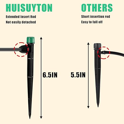 - Quick Connect Design: Upgrade drip irrigation emitter can be connected directly to 1/4" irrigation tubing,not easily detached.And it has been designed with an extended length of 6.5 inches.Easy to install without any other tools.Just push the tube firmly onto the barb and tighten the nut. Locks increases the tightness and will not leak.