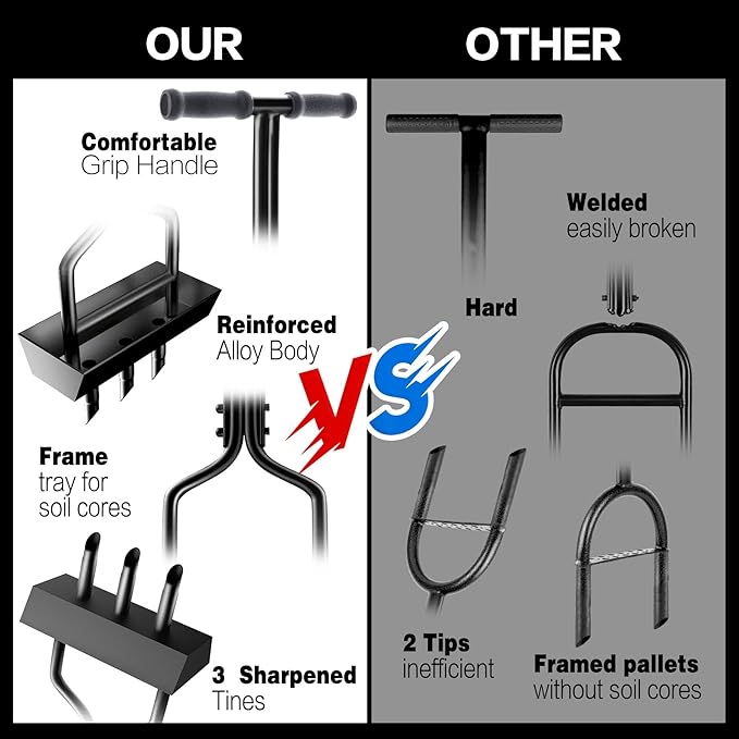 - 【User-Friendly and Efficient】Our Lawn Aerator Tool features 3 sharp jacks designed with low resistance, requiring minimal force for effortless use. This design improves efficiency, saving you time and effort. Additionally, the T-bar is equipped with a comfortable soft grip pad for easy and comfortable usage.