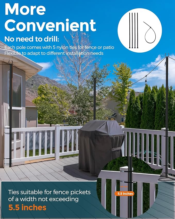 • 【MULTIPLE USE OCCASIONS】: This light poles for outside string lights are suitable for any party lighting. Can be used in lawn, fence,patio,deck etx. Let you safely and easily hang up a wide variety of home and garden decor including string lights, lanterns, flags,balloons,garland,streamer or wind chimes.