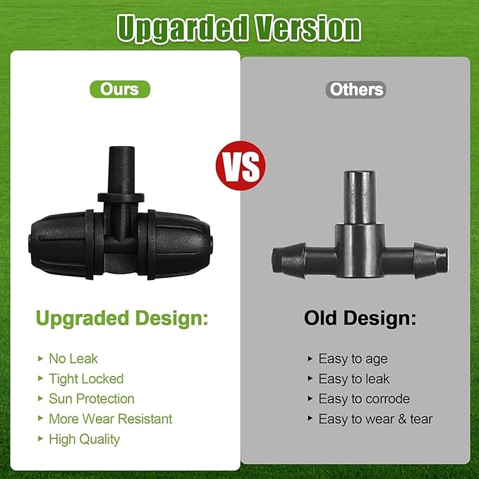 - 【Easy Installation & No Leak】These drip irrigation fittings features the barb design for a secure leak-proof connection, and the twist lock adds extra hold to the vinyl tubing. Easy to install without any tool, just connect the 1/4" water pipe firmly at both barb ends and micro sprinkler head in the middle flat mouth.
