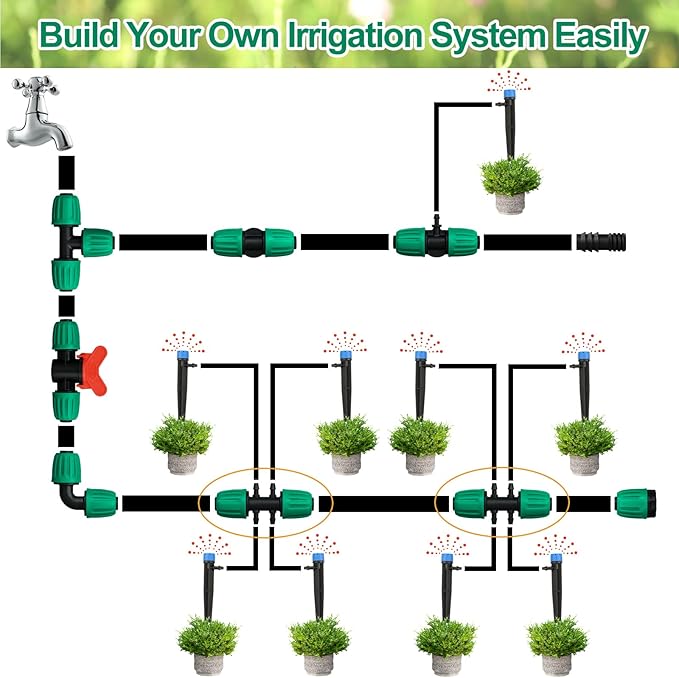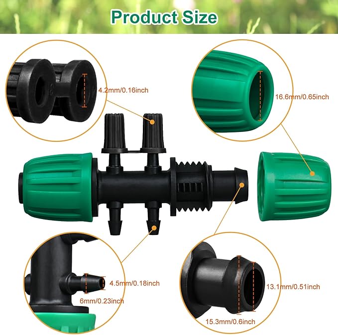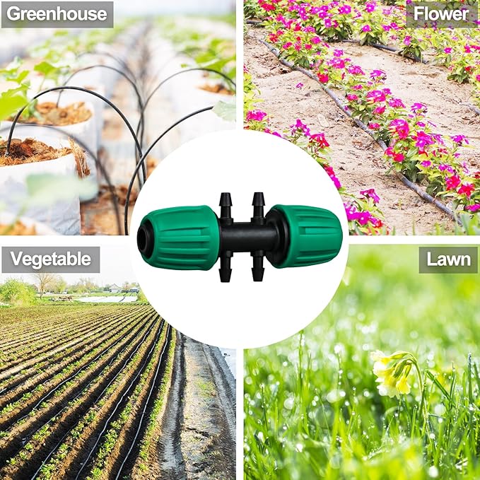 - 【Wide Application】The drip line parts are ideal for garden greenhouse, flower bed, vegetable raised beds, landscaping, aquatic, hydroponic, lawn, patio and agricultural watering applications. The lock barbed tee is compatible with Raindrip, Rainbird, Orbit, Hydro-Rain, and other major brands for 1/2 to 1/4 inch drip blank distribution and emitter tubing.
