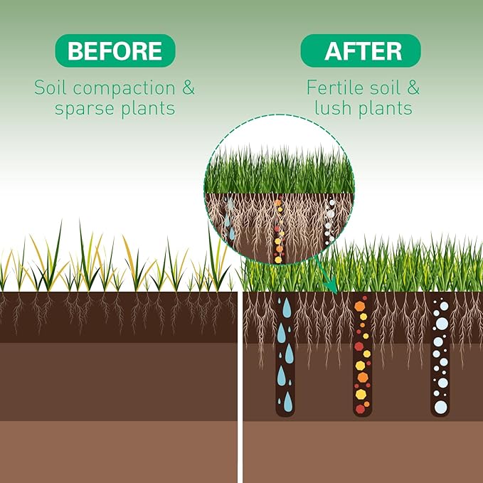 - 【Good Helper】-Pulse aeration has 4 sharp pulses, aerator lawn tool will help you loosen the soil, penetrate the ground and reduce soil compaction, allowing water, oxygen and nutrients to penetrate smoothly to the roots of plants and help them grow better.