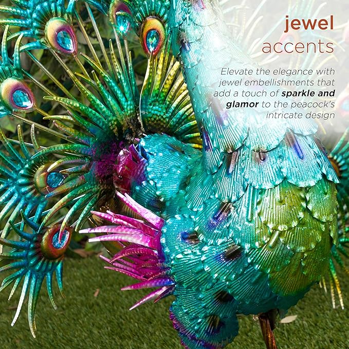 - STUNNING METAL PEACOCK STATUE: Bring an air of majesty to your space with this peacock statue, featuring its gorgeous feathers on full display