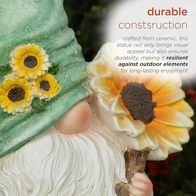 - GNOME HOLDING SUNFLOWER GARDEN STATUE: Adds a playful and inviting ambiance to any indoor or outdoor setting such as gardens, entryways, patios, backyards, pathways, decks, and more
