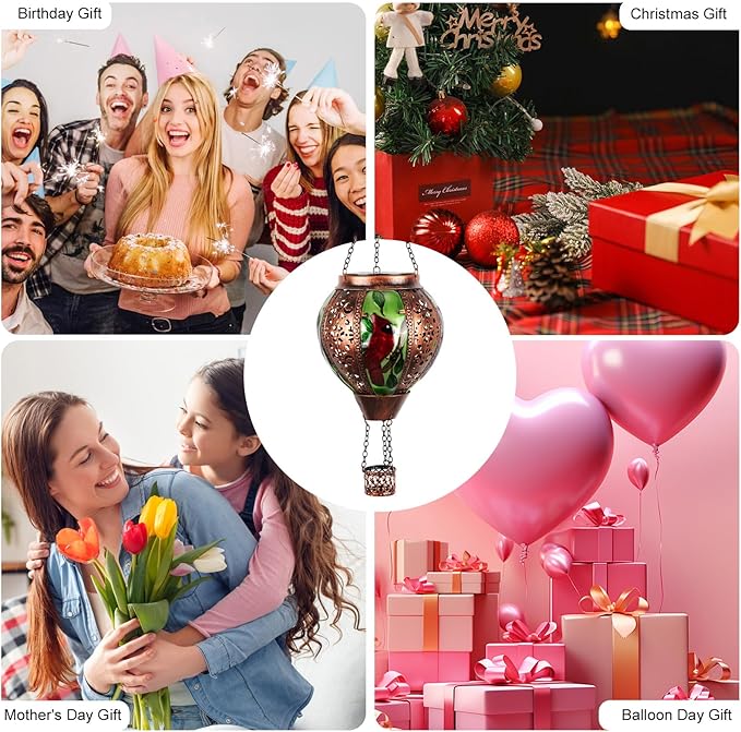 - 【Unique Hot Air Balloon Design】This hanging solar light is composed high-quality metal and cardinal glass with lifelike flame lights. As night falls, their glow adds warmth and comfort to your garden, patio, yard, path, and more, great Christmas decorative lights.