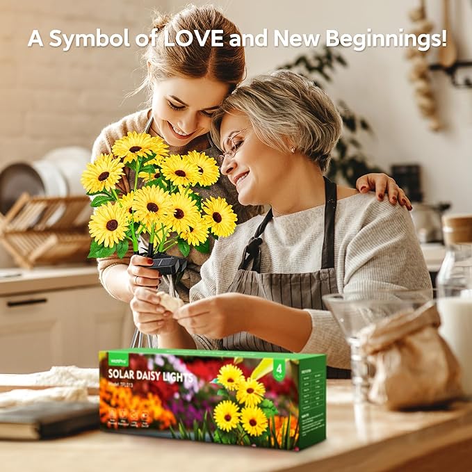 - BEAUTY and ELEGANCE SOLAR FLOWERS: Our 4 pack solar garden lights come with 16 bigger solar daisy flowers lights, each petal, leaf, and bud is crafted with exquisite detail, offering a more realistic flower appearance. The daisy-shaped petals and vibrant colors make them a charming addition to gardens, patios, yards, pathways, walkways and driveways at day. When evening, the glowing flowers will bring a touch of beauty to your outdoor space