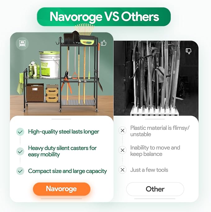 - đ¨ăLarge Capacity Garage Organizeră: The overall length, width and height are: 33.5" x 11.8" x 32.5". Navoroge garden tool holder can hold up to 40 tools in total. Unique storage holes are designed to hold multiple kinds and sizes of tools, perfect for gardening and lawn tools, as well as cleaning equipment.The garage organizer also comes with two additional metal platforms that can be used to hold heavy tools such as power tools, hoses, and more.