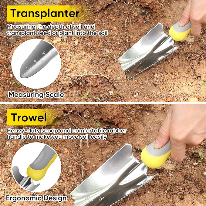 - 【Ergonomic Non-Slip Handle】 Truly ergonomic gardening hand tools for different hand sizes! Our gardening tool set comes with super comfortable & soft non-slip rubber handle, giving you ultimate comfort and security. Perfect clear finger grip and palm rest can provide a secure grip, preventing slippage and reducing hand fatigue. Besides,each handle has a useful hanging hole for easy hanging and storage, save your energy and effort
