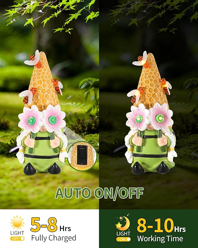 - π‘ LED Lighting: As dusk falls, watch the gnomeβs flower eyes and bee come alive! The integrated LED lamp emits a soft glow, highlighting its intricate features.