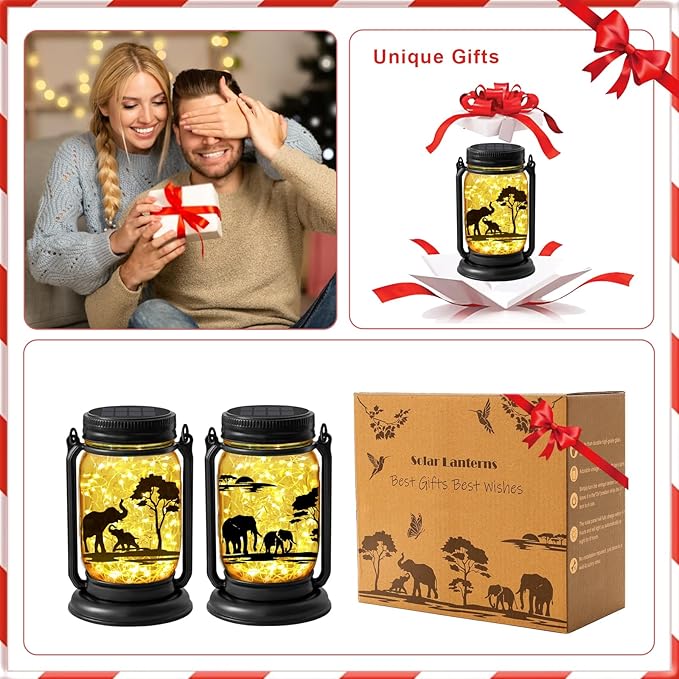 2 Pack Outdoor Hanging Solar Lanterns, Elephants Vintage Glass Mason Jar Fairy Lights, Mothers Day Gifts for Women Mom Grandma, Waterproof Garden Lights for Patio Yard Lawn Tree Party Decor