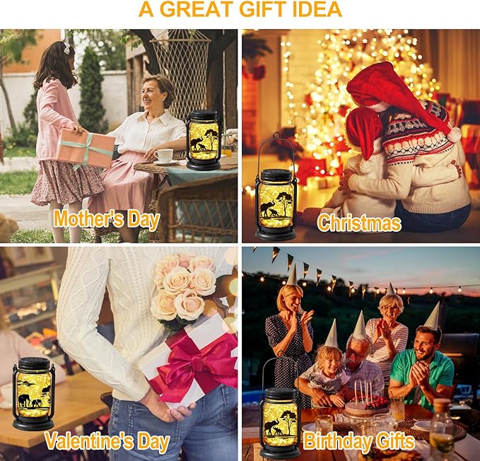 - UNIQUE MASON JAR LANTERNS--It's quite common to get mason jar with LED string lights in the market. To make a distinctive one,our designer combine mason jar with LED lights and 2 Elephant Tree Theme PVC stickers, which has elephant playing near trees projection effect . The styles of lantern and warm light can make your room and garden full of unique fun .Not just a hanging solar lantern but an unique solar lamp decor