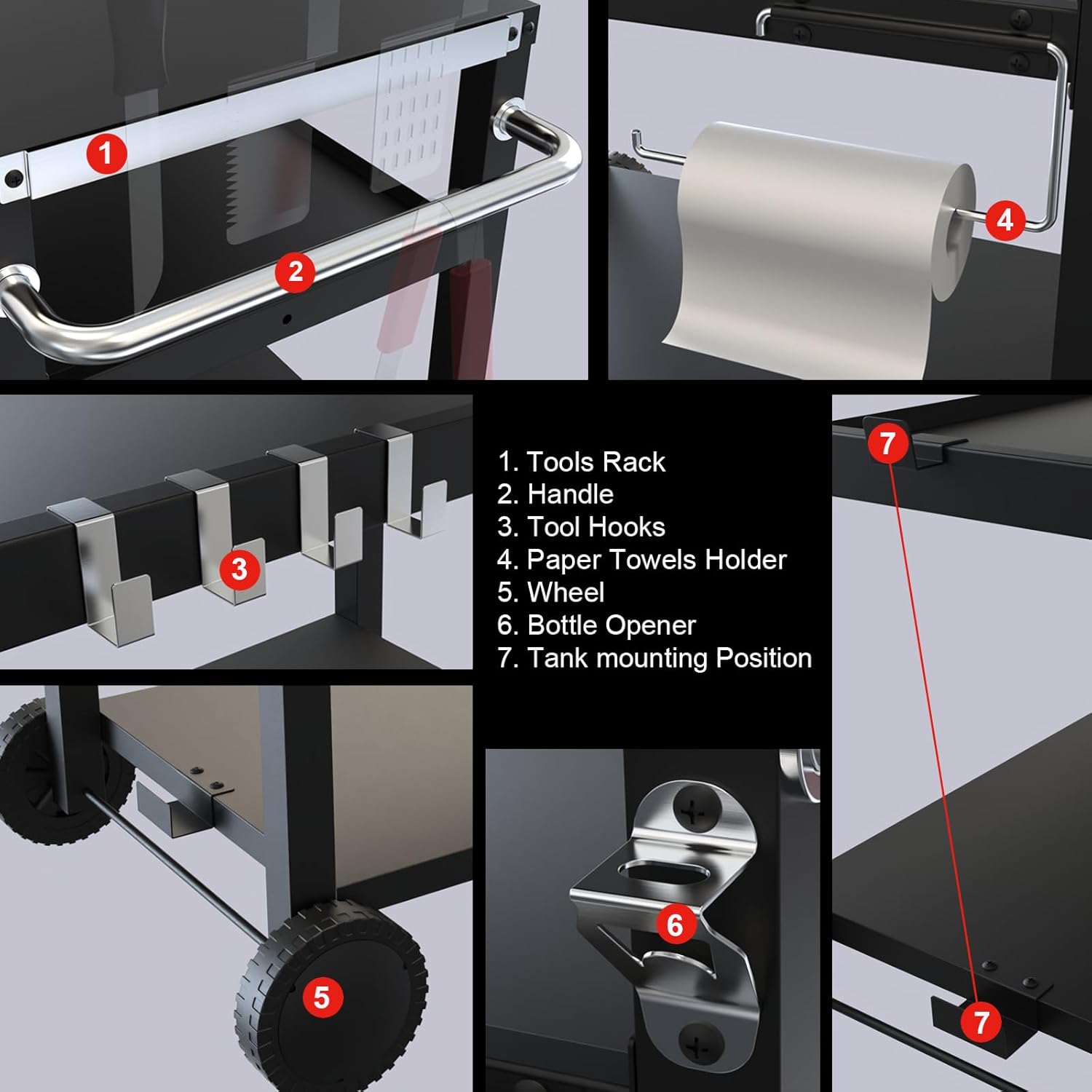 - Wheels for Easy Mobility: Designed for convenience, this grill cart is equipped with 2 wheels, making it effortlessly movable. Whether you're setting up a barbecue on the patio or taking it on a camping trip, the cart provides mobility without sacrificing stability.