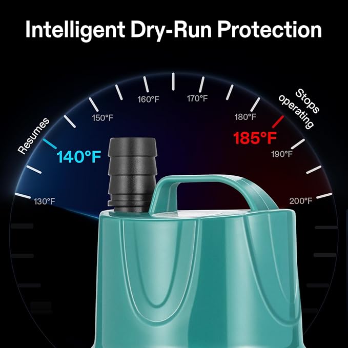 - Dry-Running Protection: Built-in thermal protector chip automatically shuts off the motor when temperatures reach 185°F (85°C) to prevent dry running, ensuring safe operation