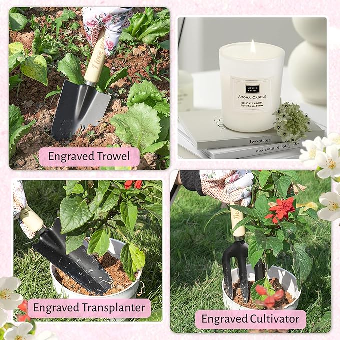 - 【Perfect Garden Kit for Women】Our gardening tools pink is the ideal gift for women who love gardening. Perfect for Mother's Day, birthdays, or any special occasion. This kit combines functionality with beauty, appealing to plant enthusiasts and promoting quality outdoor time.