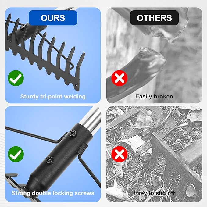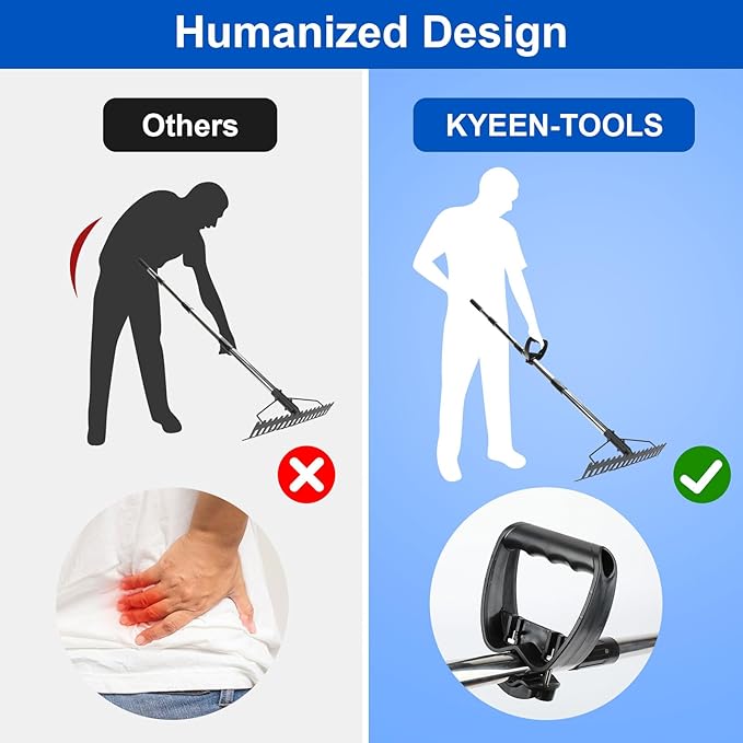 - 【Back Saving Handle】Our heavy duty garden rake comes with a back saving handle, by moving the handle you can find the right position for the handle, so you can avoid bending down and maintain a comfortable standing position when using it, ergonomically designed.