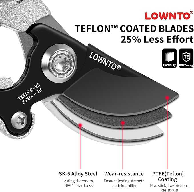 - 25% LESS EFFORT: The Pruning Shears features a PTFE Low-friction blade coating makes smooth cuts, reduces gumming, and helps resist rust, reduces cutting effort 25% compared to titanium or non-coated blades