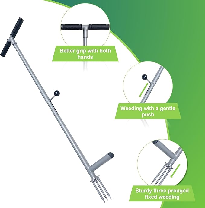- 【Eegonomically Design】Different from the original vertical weeding machine, our company's product design has a grip held by both hands, through the foot to insert the three-pronged steel fork into the root of the weed for digging, the middle of the push handle can be very simple to remove the weed, more convenient for you to stand weeding operations