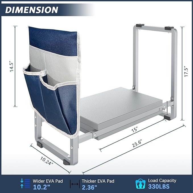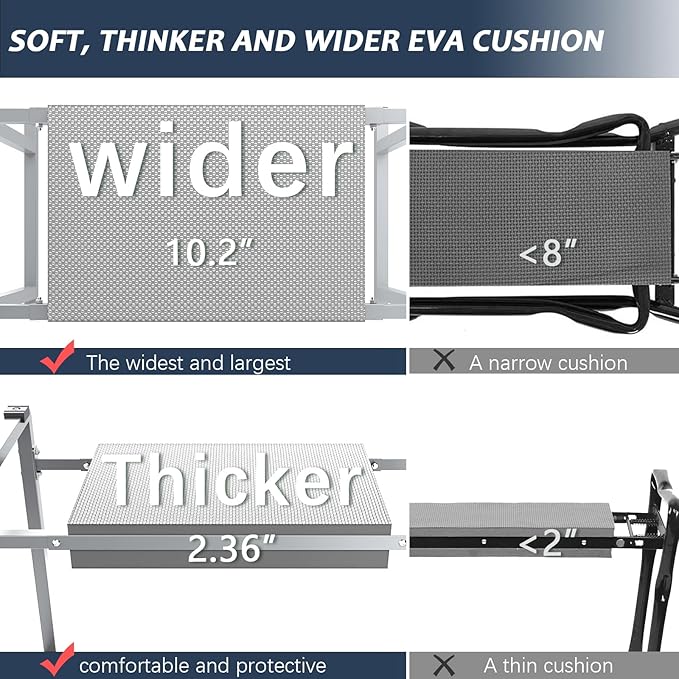 - New PATENT design: 2.36" Thinkened and 10.2 Widened EVA foram cushion; We have widened the EVA cushion pad to 10.2 inches, which is currently unique in the market and is also the widest and largest. That means the cushion will be more comfortable and more protective to help alleviate back and knee pain. Most of all, Budget friendly.