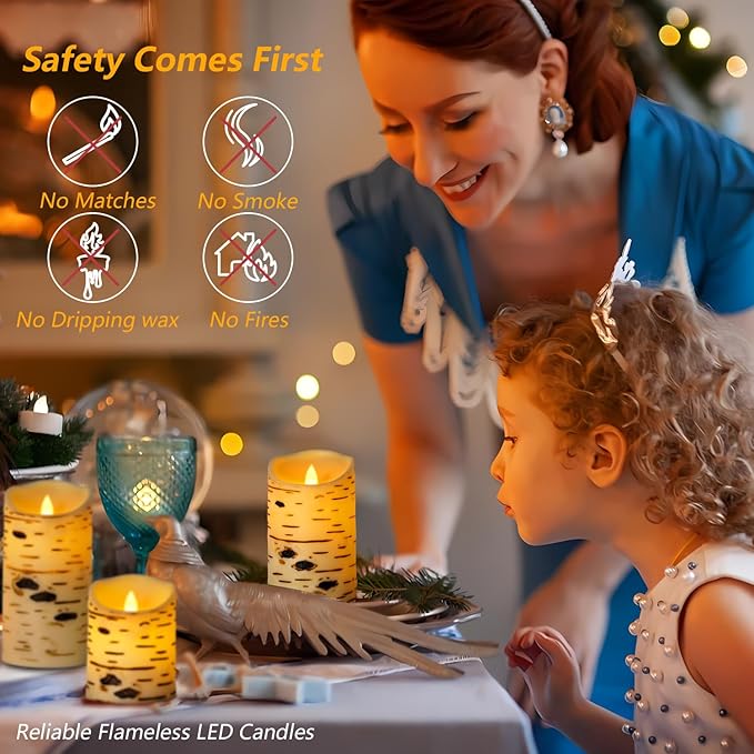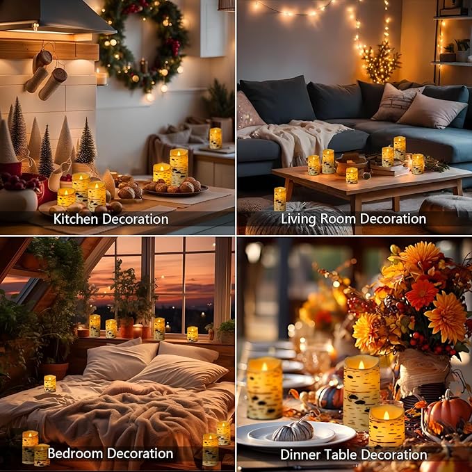 - ✨REALISTIC FLICKERING FLAME: This battery powered candle set uses advanced flame simulation technology to allow the 3D moving wick that elegantly dances like a real burning flame. As the soft glow filters through the candlelight shell, it blends with the colour of the simulated birch bark,casting a natural warm light.Ideal for holiday decorations, making them the perfect choice to enhance the visual appeal of any space on memorable occasions. Whether it's Christmas, Halloween, Valentine's Day or Thanksgiving, these battery operated candles with flickering flame add a festive touch.