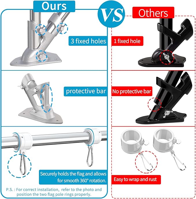 - 🇺🇲Upgraded Bracket and Tangle Free Rings: The high strength aluminum alloy flag pole holder has unique protective bar and 3 fixed holes to make the two-position (90° and 45°) flag pole more stable. The two new designed flag rings and two sturdy carabiners, which could make the flag tangle-free in the wind. And Adjustable length swivel flag pole kit can be installed according to the different size flags.