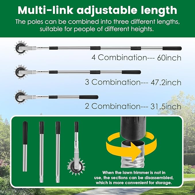 - 【Adjustable length manual edger lawn tool for sidewalks】Our lawn edger comes with an adjustable pole, which is very simple and convenient to assemble, and can be set to three different lengths (31.5 inches, 47.2 inches, 60 inches) to accommodate users of different heights. In addition, the product also has a non-slip handle, which can improve comfort and friction during operation