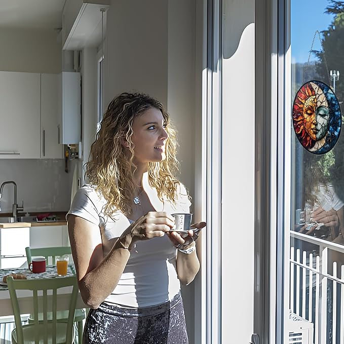 - 【stained Glass Window Hanging】This is a very beautiful Sun and Moon Decor Suncatcher with a size of 6x6 inches which is perfect for windows, adding a touch of color without obstructing the view outside. This piece of glass was cut individually and painted by hand. It is skillfully handmade, and it is real glass, NOT plastic or acrylic.