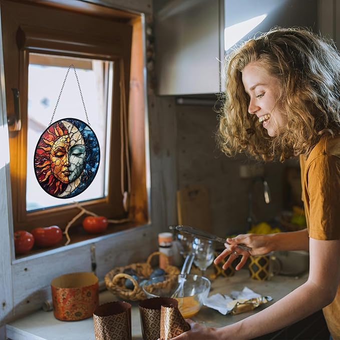 Sun and Moon Decor Suncatcher Stained Glass Window Hanging - Handmade Stained Glass Suncatchers Hanging Decoration with Metal Chain - Outdoor Garden Decor Gift for Women Christmas Thanksgiving Gifts