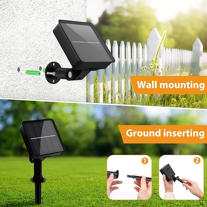 - 2 Mounting Options: Supplied with ground stake, screws and explosion proof nails. Follow the instructions to mount the solar panel on the wall or on the floor for a very quick installation