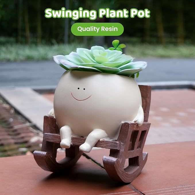 - 【Unique Rocking Chair Head Planter】This smiley rocking chair planter has a cute smiley face design in quality resin and sits on a retro rocking chair. When the gentle breeze blows by, the chair planter rocking and smile swings, it adds a touch of fun and charm to your patios, rooms, tabletops, and garden—creating a joyful atmosphere.