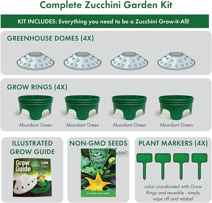 - GROW BIG AND GROW AT HOME! Prepare to be astounded by your prolific green thumb when using our Zucchini Grow Kit to enhance your backyard garden. Packed with organic, premium seeds, and Plant Markers featuring our patented Grow Rings and Greenhouse Domes, this kit ensures a joyful, and abundant zucchini-growing experience.