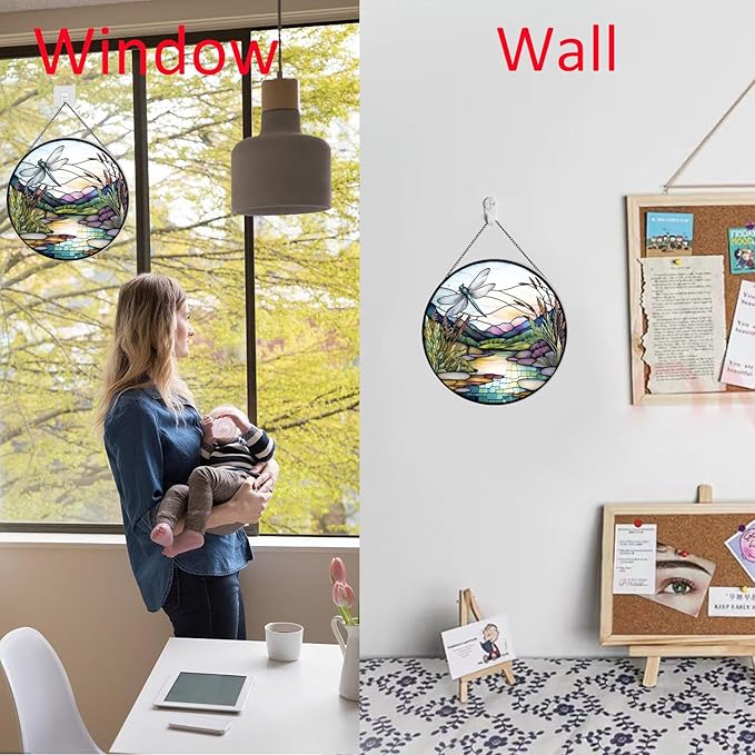 - 【Easy to Use】This stained glass window hanging painted a river scenery and dragonflies, vivid and full of vitality. Ideal for those who love pastoral and nature, and seek a return to original nature! You can hang it in the position you want to decorate,it's a great home decor.