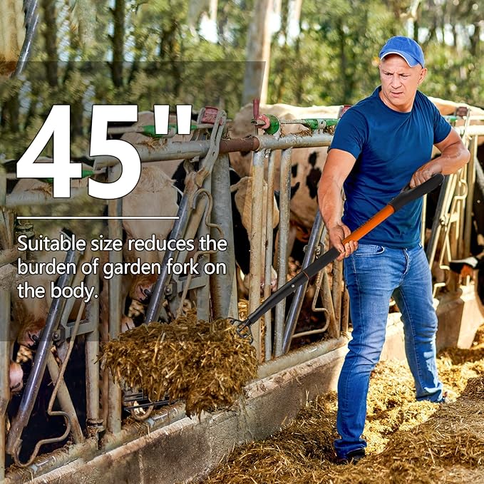- Scientific Size: The 45-inch manure fork is designed for adults, the reasonable size provides sufficient operating range, effectively reduces the physical burden brought by frequent bending, improves the operating comfort of the pitch fork, and is an ideal assistant for your gardening work.