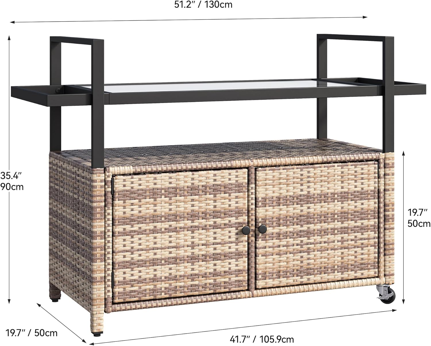 YITAHOME Large Outdoor Kitchen Wicker Island Rolling Cart & Patio Bar Table, w/Wheels and Black Glass Table Top Backyard and Poolside Light Brown