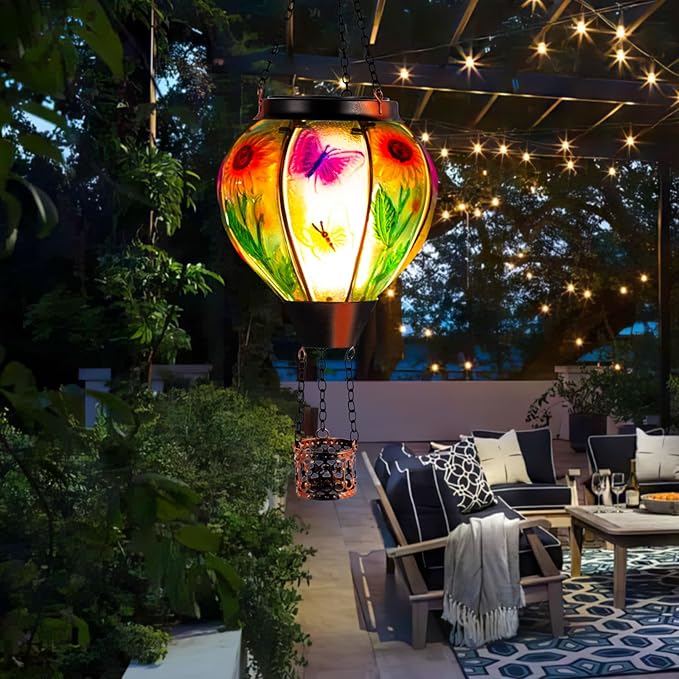 - Durable & Waterproof:Made of high-quality metal and adorned with butterfly-patterned glass, our solar hot air balloon outdoor lantern features a rust-resistant coating for lasting beauty. The waterproof design ensures reliability in any weather, making the hot air balloon solar lantern a solid choice for outdoor hanging decor.
