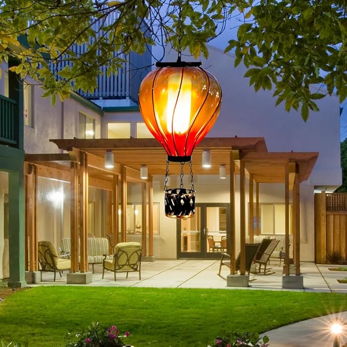 - 【Wide Application】Hot air balloon solar light is a great home decoration, both indoors and outdoors, you can hang the solar lantern on porches, trees, pergolas, balconies, or ledge. You can enjoy its unique, bright appearance during the day, and when the flickering flame lights up at night, it is a different scene.