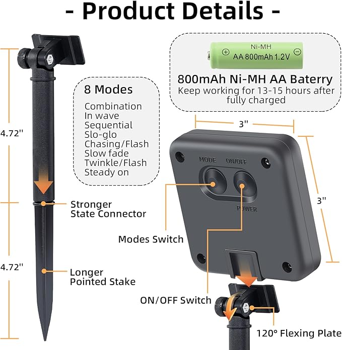 - 🌻🌻【Versatile Modes & Convenient Memory】🌻🌻 The solar powered string lights boast 8 lighting modes for easy switching, creating different atmospheres as desired. With our solar string lights for outside’ built-in memory function, you can maintain your preferred modes, eliminating the need for daily resets.